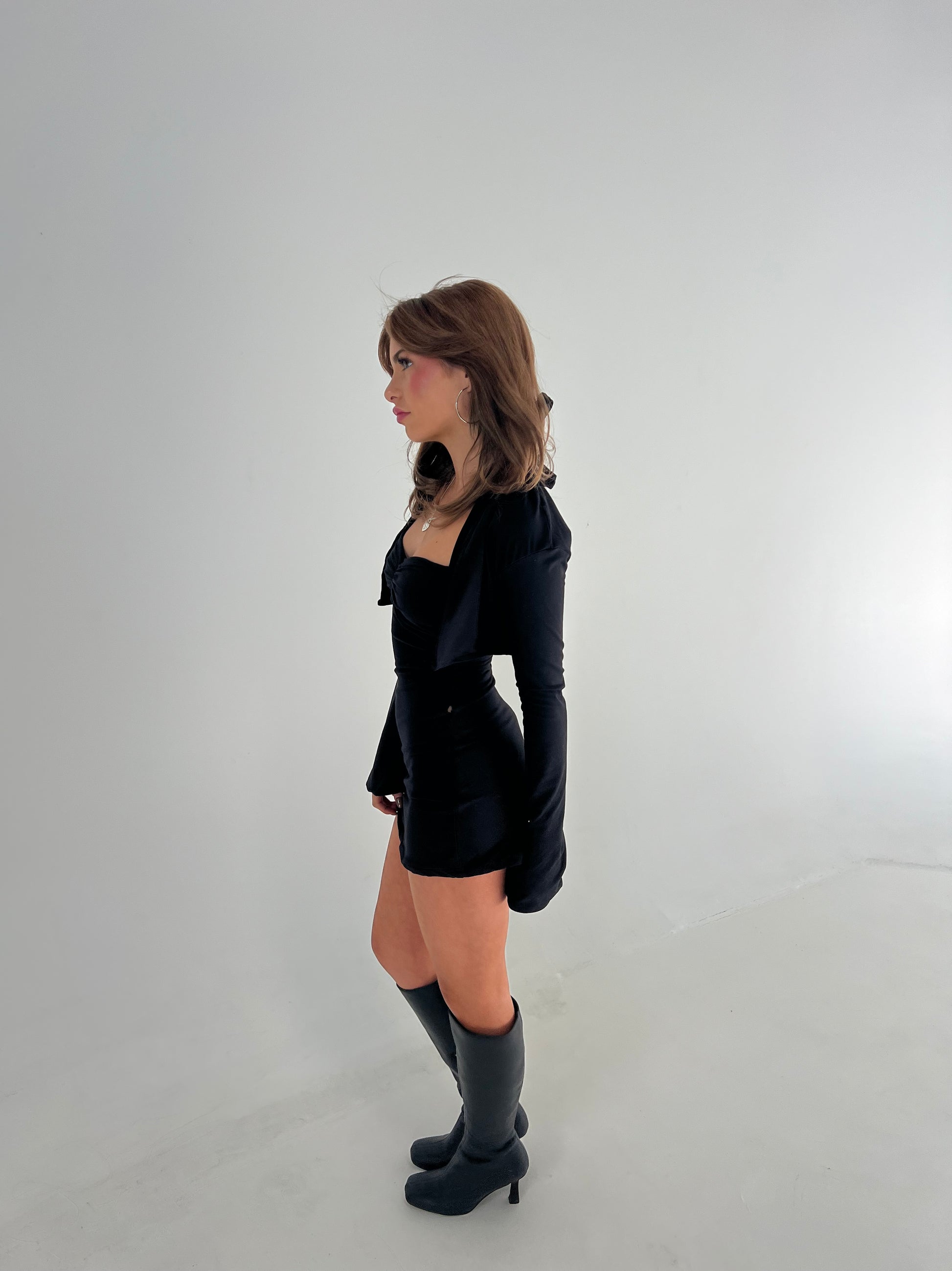 A soft and romantic two-piece mini dress set made from stretchy, body-hugging fabric. Featuring a halter-style mini dress with adjustable straps and a matching long-sleeve shrug, this set is designed to flatter and move with you. Wear them together or separately for an effortless, feminine look.