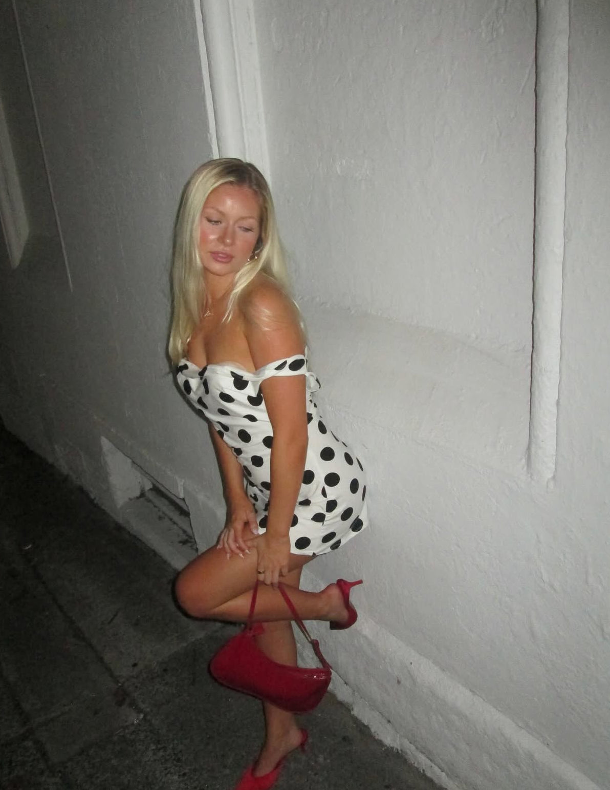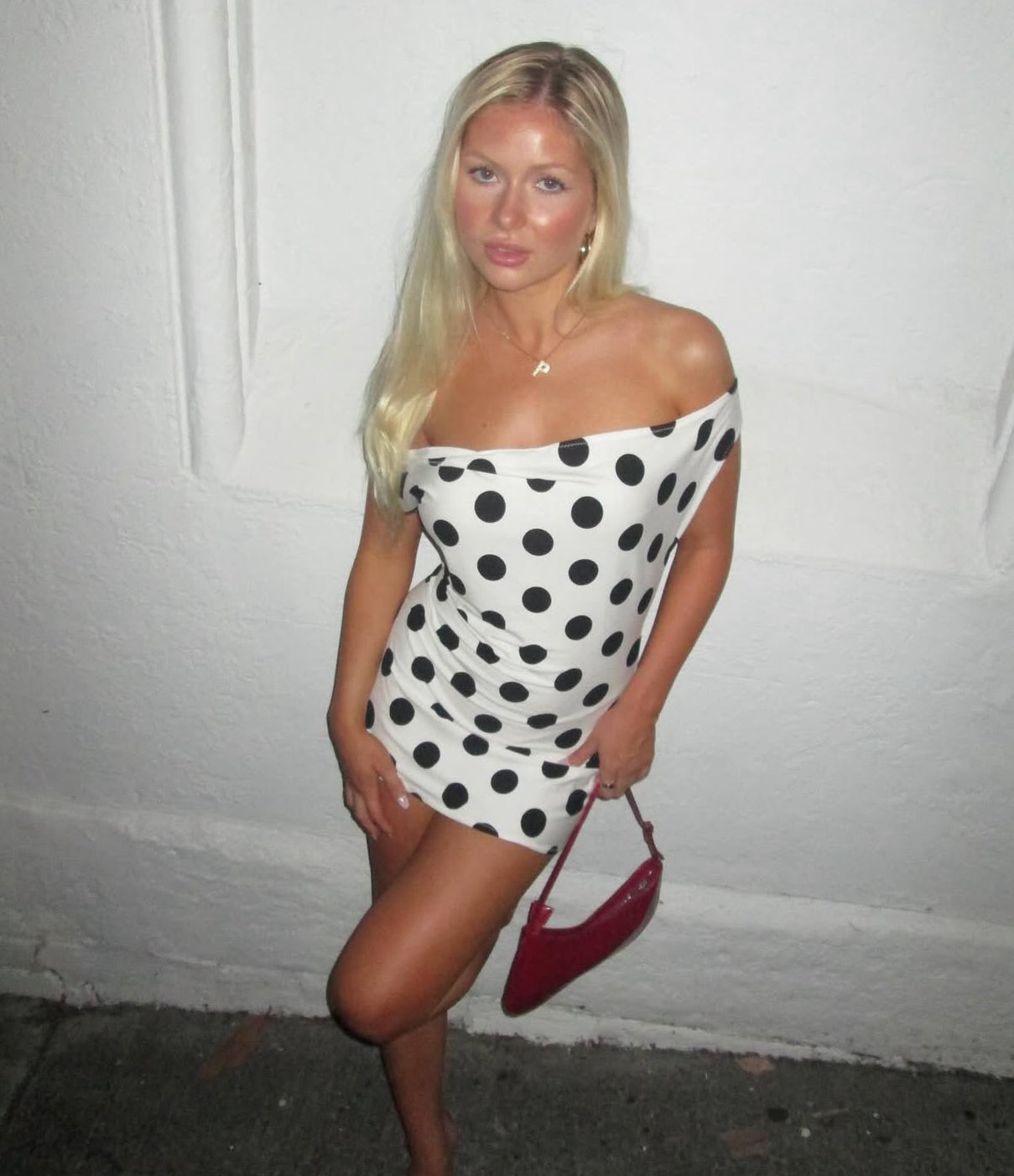 the cutest off the shoulder, scoop neck polka dot mini dress