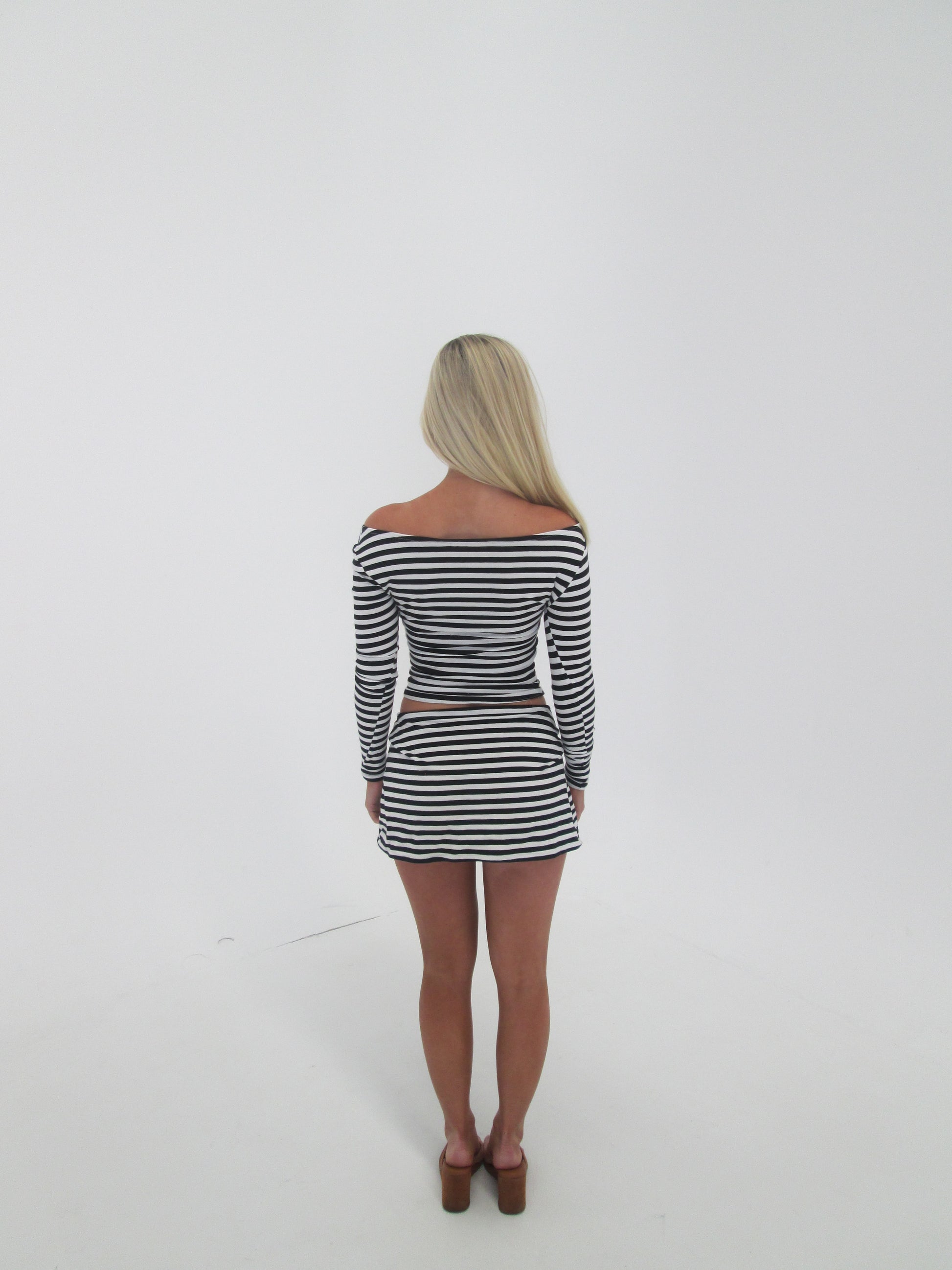 Our two piece striped set includes a long sleeve top and mini, both of these are stretchy for adjustability and comfort. After ordering this set the timeframe for shipping is 3-4 days to be created and shipped